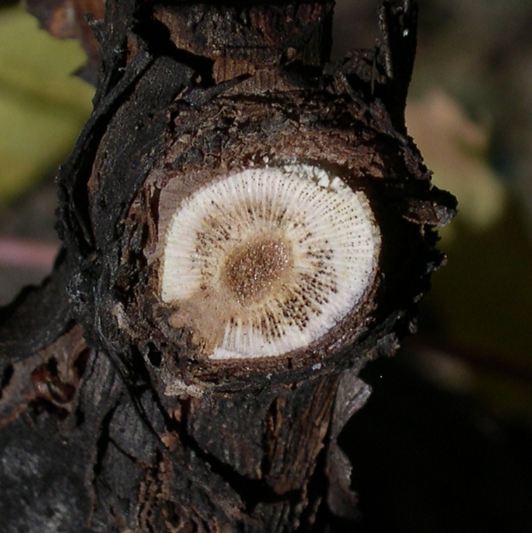 If the discoloration is brown, rather than black, the vine might be suffering from Botryosphaeria pathogens. Infected vines may not show striking foliar or shoot symptoms.