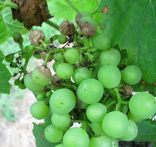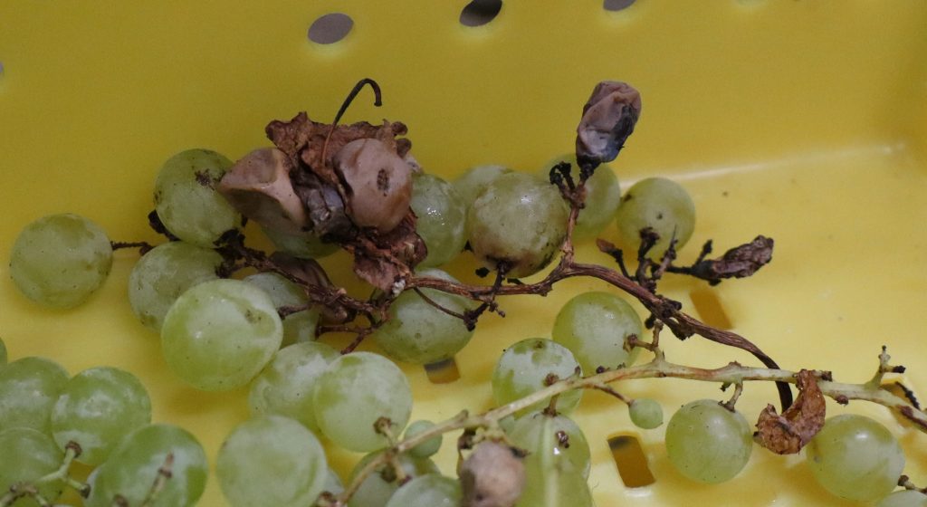 Black Rot is caused by a fungal pathogen, Guignardia bidwellii (syn. Phyllosticta ampelicida), that causes infection on leaves, berries, as well as the shoots and rachis of grapevines. The leaf symptom of black rot is characterized by brown lesions with dark edges, containing dark fungal fruiting bodies. On shoots and rachis, it causes dark necrotic lesions that contain the fungal fruiting bodies. On fruit, the fungal fruiting bodies develop in a concentric “bull’s eye” pattern, and the infected berries eventually mummify. In some cases, black rot is mistaken for Phomopsis and vice versa, where infection on the rachis causes berries to drop.