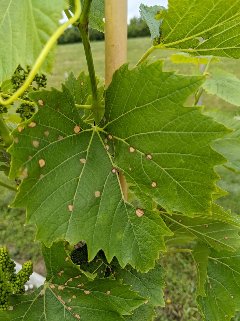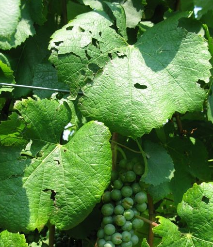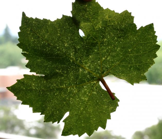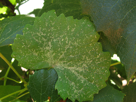 Mites – Grape rust mites (Calepitrimerus vitis Nalepa) can cause feeding injury on leaves. European red mites, Panonychus ulmi, cause chlorosis and bronzing by piercing and feeding on the leaf epidermis. Two-spotted spider mite feeds on the underside of leaves, causing yellow stippling on the top side of leaves.
