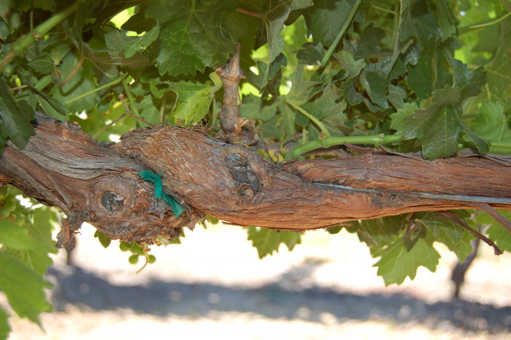 Mechanical damage – Trunks may become damaged by mechanical means. Feeding activities by animals, girdling from wires or vegetation, or human activities such as a use of weed eater or improper removal of sucker shoots, can injure the vine. The injury itself can result in water stress-type symptoms (short internodes, yellow discoloration of leaves, etc.), but the injured trunk is often subject to infection by plant pathogens or necrotic microorganisms, such as grapevine crown gall.