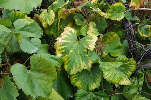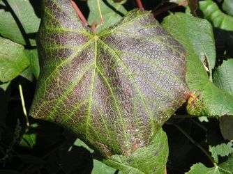 Magnesium deficiency –Symptoms are usually expressed in older basal leaves. Leaves become yellow along the margin, while the tissue around the main veins of the leaf remains dark green. Red cultivars express reddening rather than yellowing. Magnesium deficiencies are common in vineyards with a high potassium to magnesium ratio and/or low pH in soils (<5.5 pH). Nutrient test of vines and soils, followed by application of necessary nutrients and/or soil pH adjustment, is recommended.