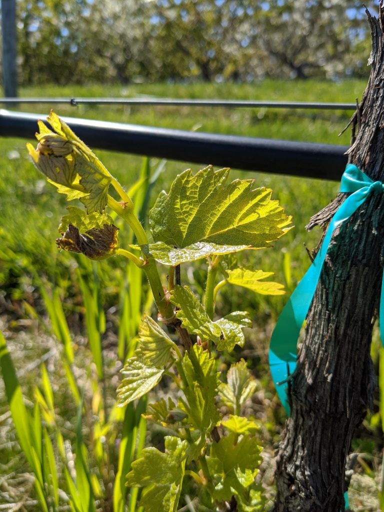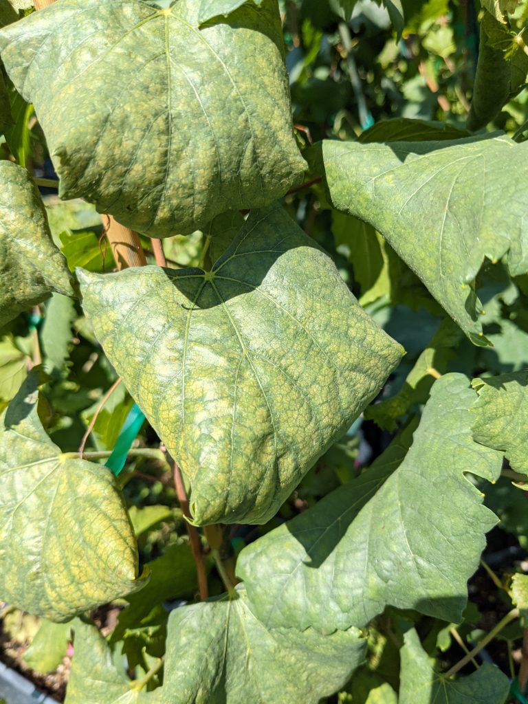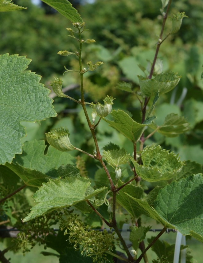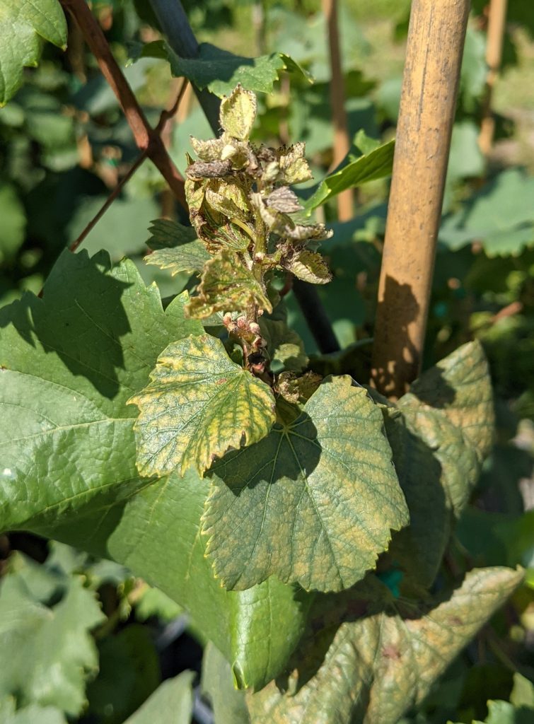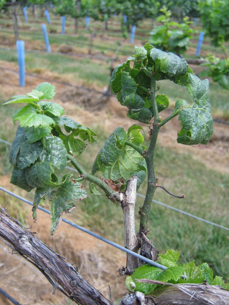 Sometimes, frost injury can deform leaves. In such cases, you will most likely find mosaic or chlorotic discoloration on leaves and shoots. You may find more symptoms in the lower part of the vineyard.